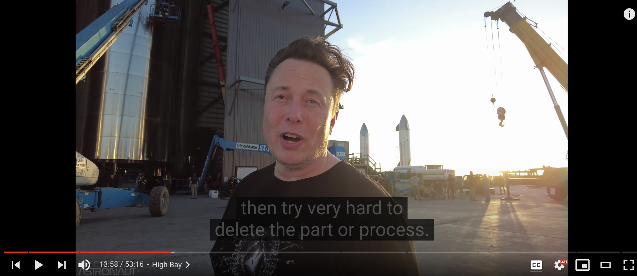 The context of Elon Musk's talk is the presentation of a SpaceX Starbase to Tim, the host of the popular engineering "Everyday Astronaut" youtube channel.
