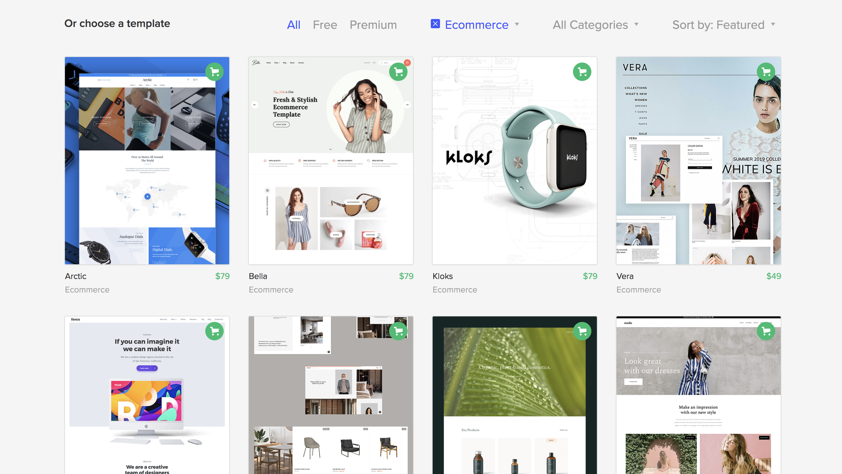 Webflow eComerce: Webflow eCommerce is a new platform and it offers 22 templates for eCommerce available for purchase in Webflow template store. Prices are from $49 to $129 with 6 free templates. They look good and can be used for a variety of business. Webflow's design tools allow users to customize these templates. Developers can make use of its extensive CMS platform.