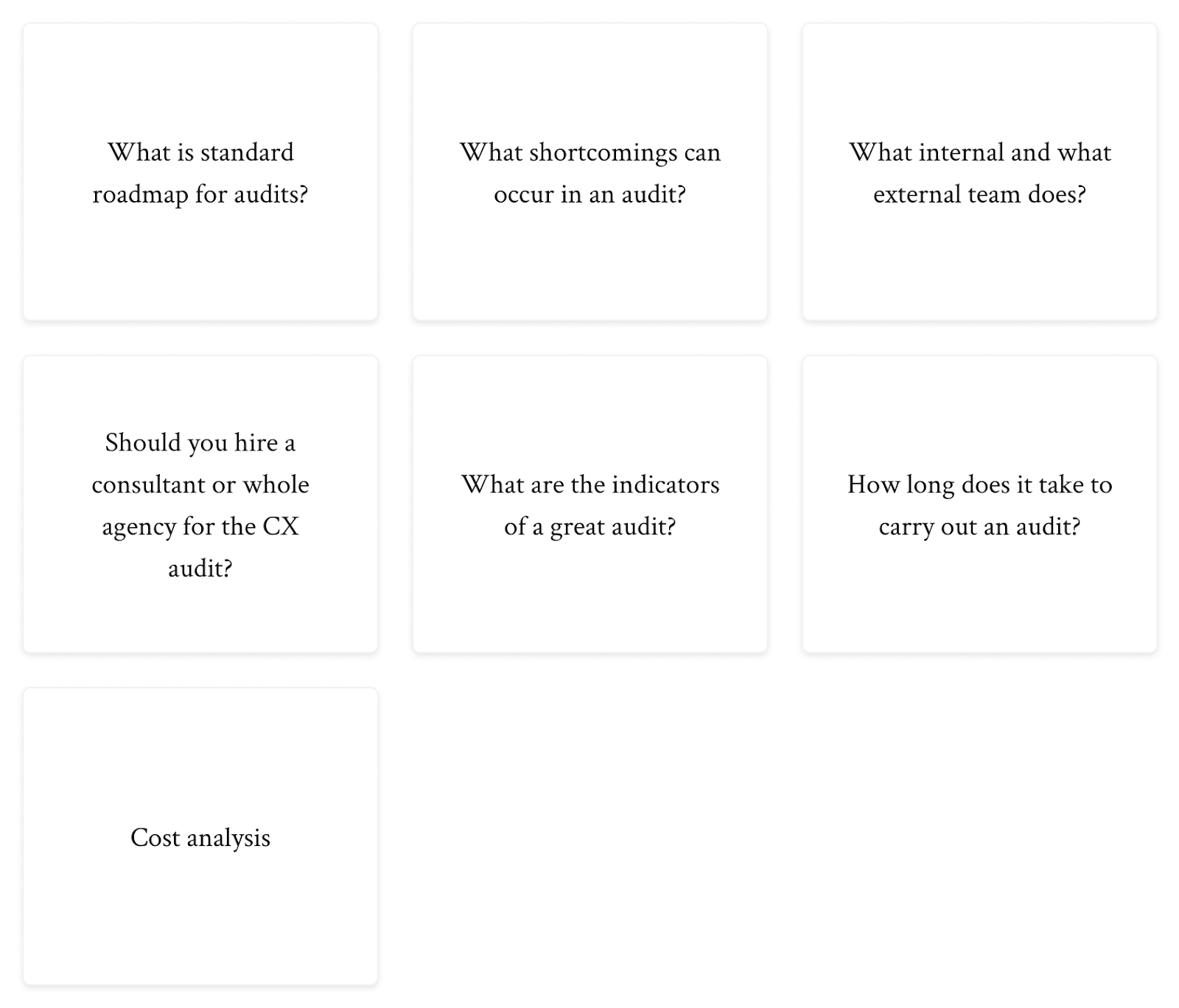 We have tailored the UX Audit to your product experience (e.g., user on-boarding, checkout, etc.). We can discuss this on our first call together.